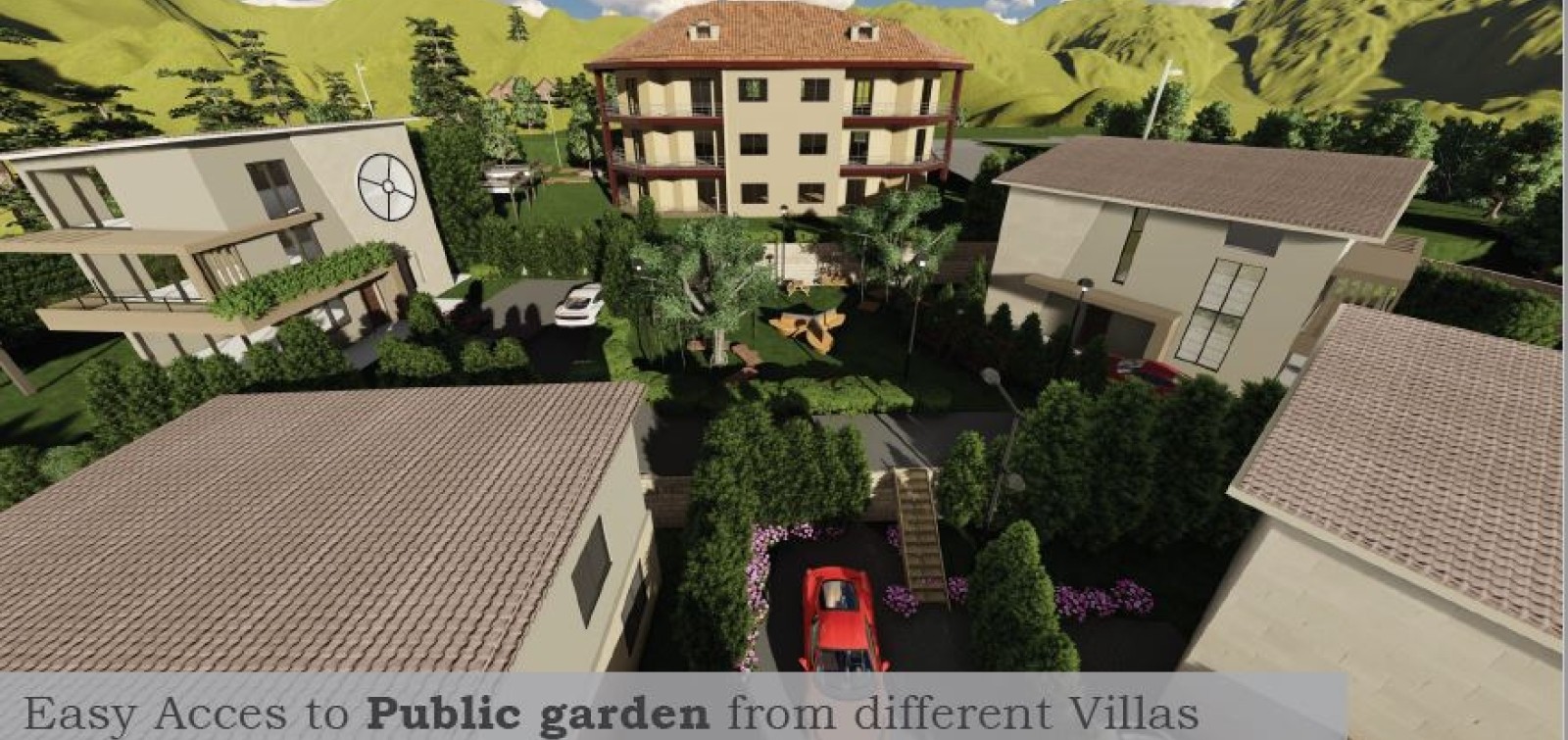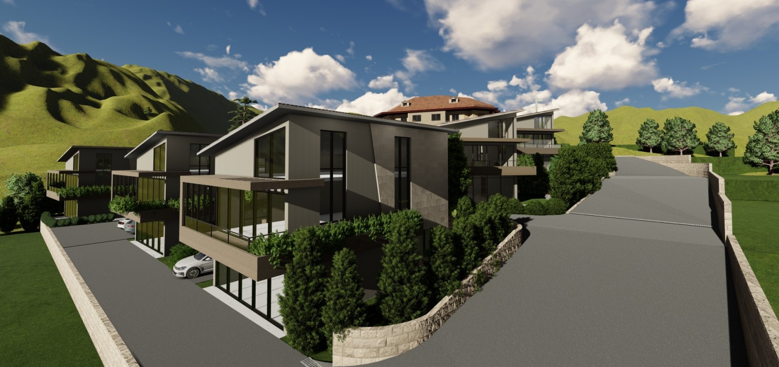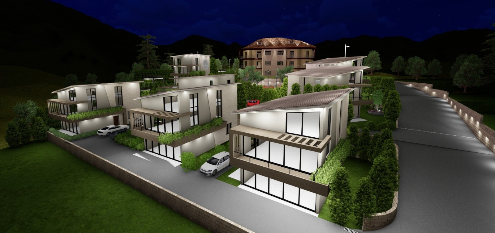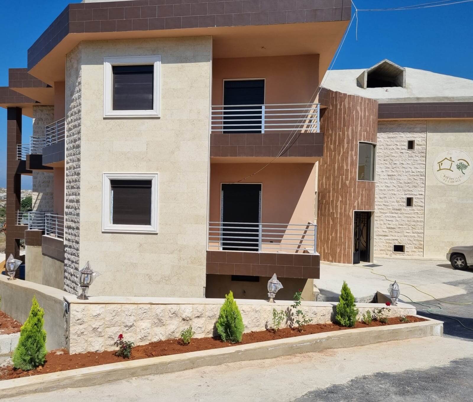 North Hills project consists of One Building with luxurious apartments adjacent to Eight Villas laid descending on a hill to provide for each unit its own uninterrupted view .